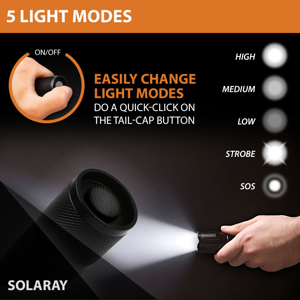 • 5 Light Modes: High, Medium, Low, Strobe and SOS