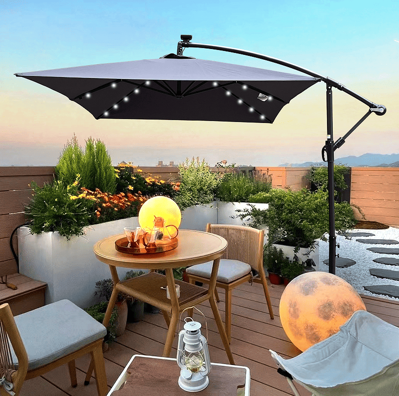 The patio umbrella has 26 solar LED lights (4 long ribs and 20.2 short ribs and 6 lamps), which will illuminate your patio when night falls. The soft lighting creates a romantic atmosphere for you. All LED bulbs are powered by a solar panel on top to save energy while maintaining perfect lighting.